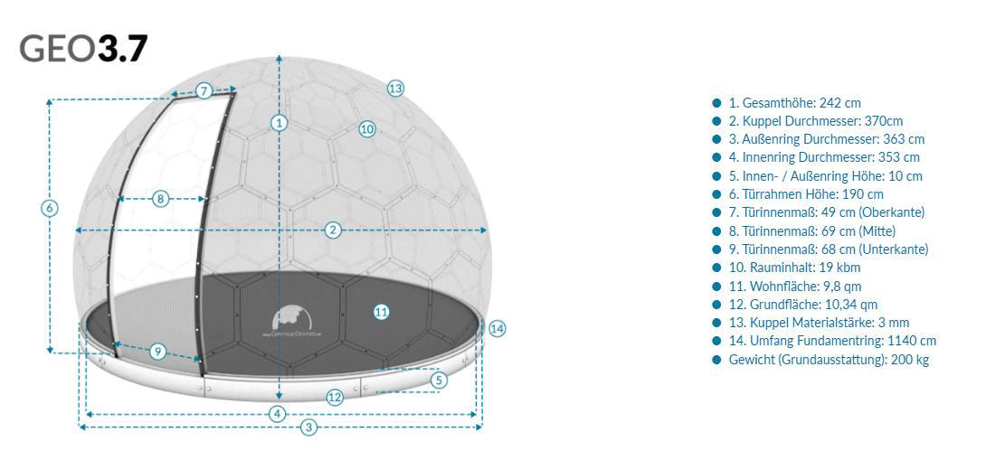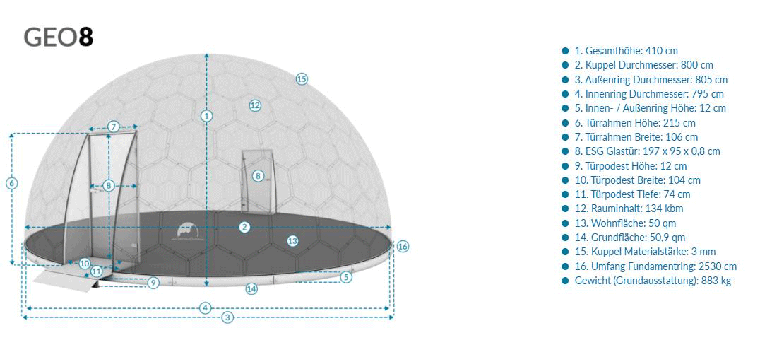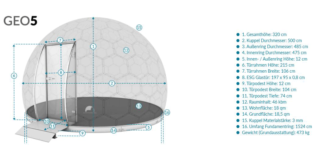 Die kompakte Domkugel eignet sich ideal für private Rückzugsorte oder kleinere Freizeitnutzungen und bietet trotz geringer Grundfläche ein beeindruckendes Raumgefühl.